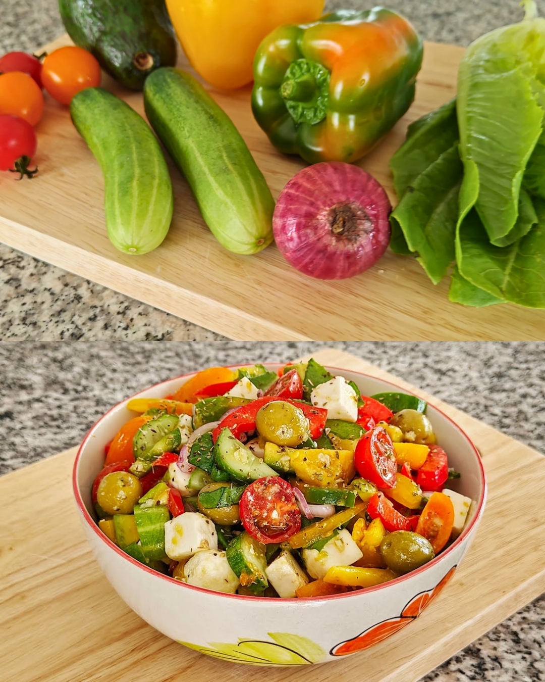 Questa fresca e colorata insalata greca combina una varietà di verdure, formaggio feta e olive, il tutto condito con una piccante vinaigrette all’aglio e limone. Perfetto per un pasto o un contorno sano e delizioso.